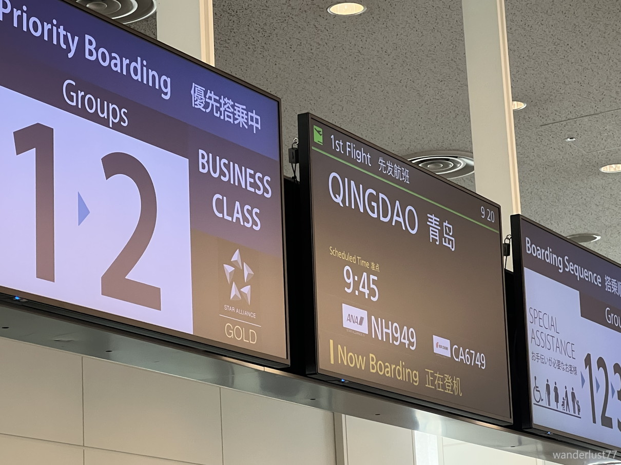 青島行き搭乗開始。窓側席なのでグループ2の優先搭乗で早めに搭乗。